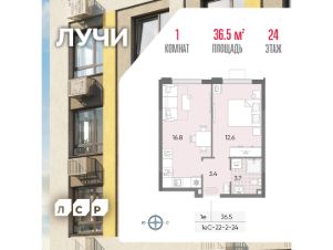 Продается 1-комнатная квартира общей площадью 36.5 кв. метров на 24 этаже жилого комплекса Лучи.