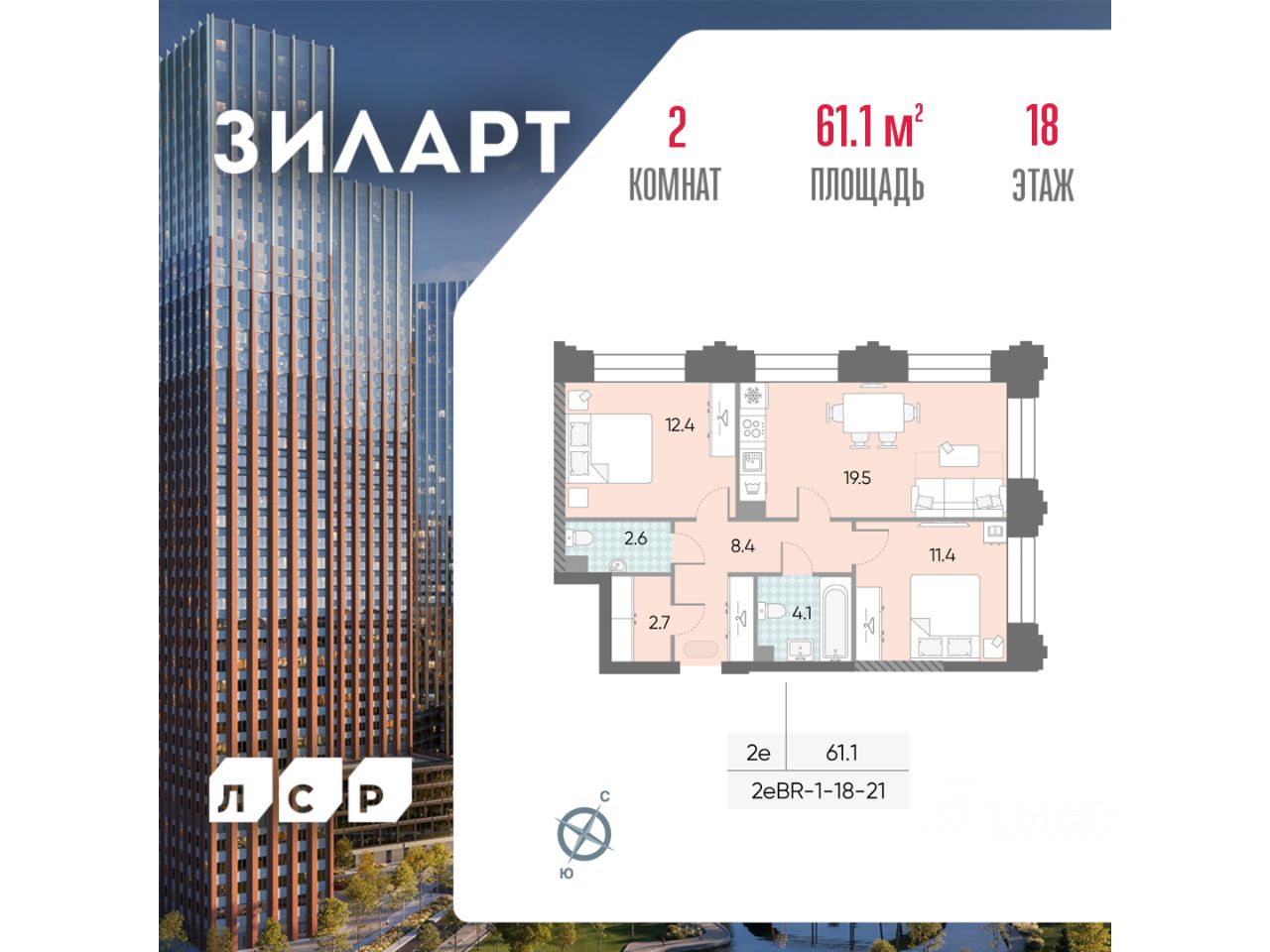 Продаётся 2-комнатная квартира в доме ЗИЛАРТ СПАРК общей площадью 61.1 кв. метров на 18 этаже.
