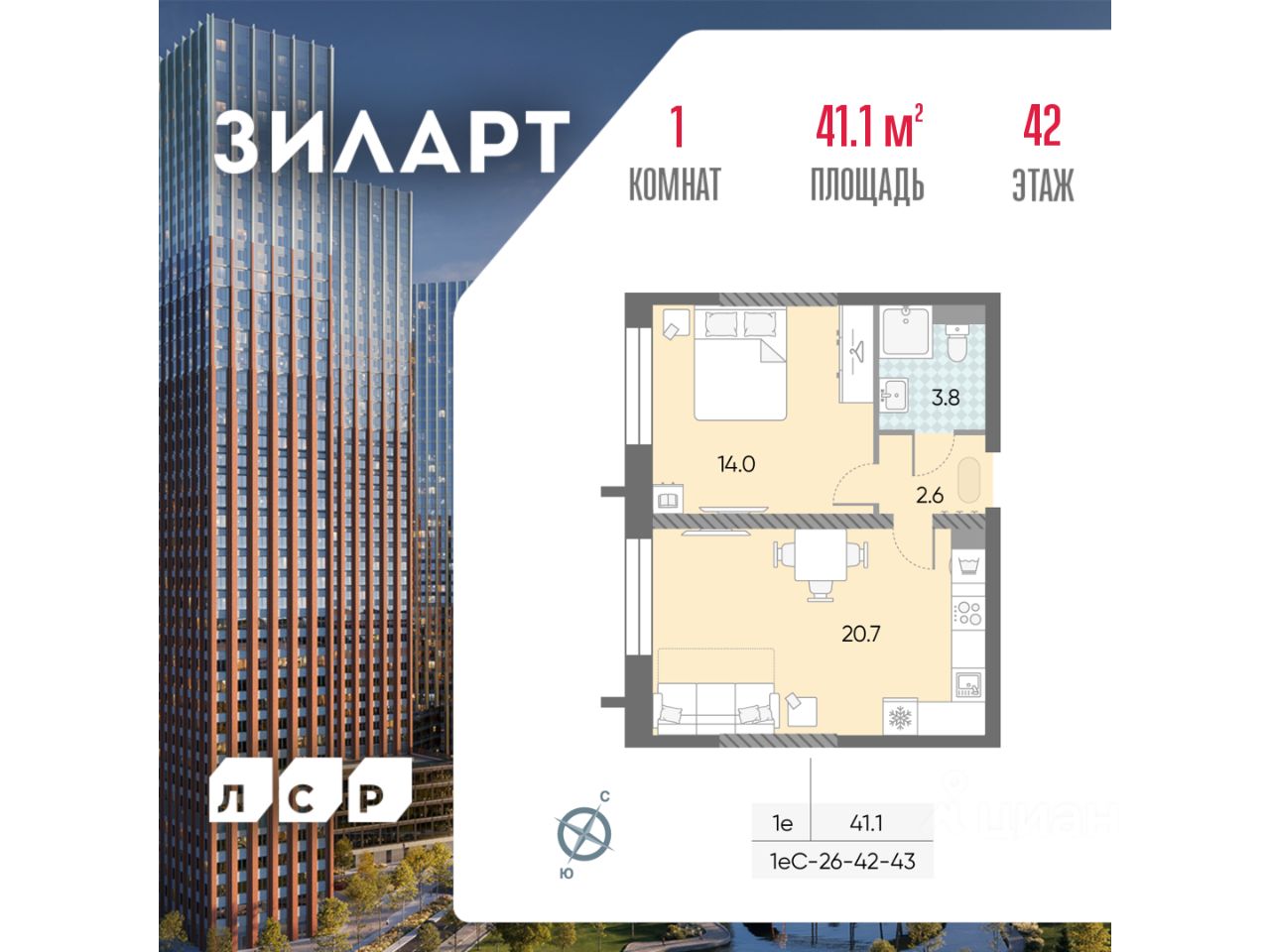 Продаётся 1-комнатная квартира в доме ЗИЛАРТ СПАРК общей площадью 41.1 кв. метров на 42 этаже.