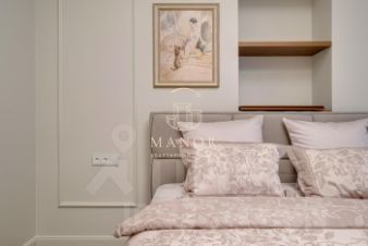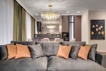 В квартире выполнен дизайнерский ремонт с использованием качественных материалов, вся мебель в квартире на заказ, заменены все инженерные системы, установлены тёплые полы, кондиционеры в каждой комнате, техника от производителя Bosch, квартира готова под ключ, в ней никто не жил и всё остается новому собственнику!