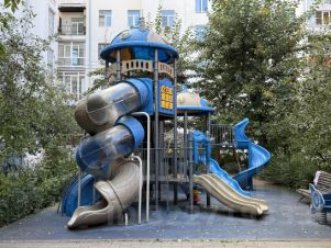 Ухоженный, зелёный закрытый двор с детской и спортивной площадками, а также просторной парковкой только для жителей.