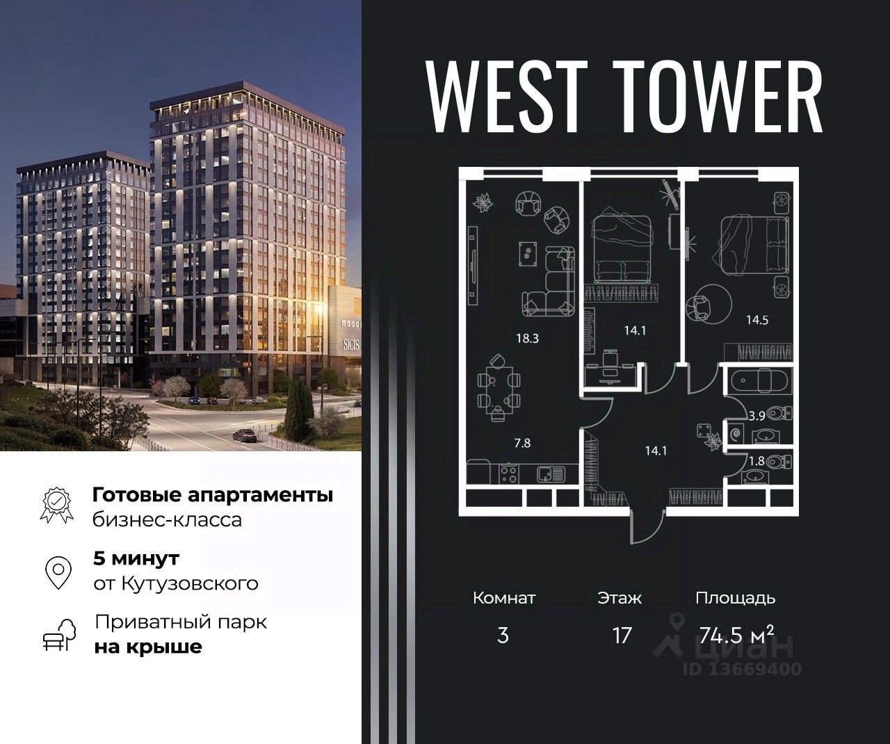 Продаются апартаменты в многофункциональном комплексе бизнес-класса West Tower в ЗАО.