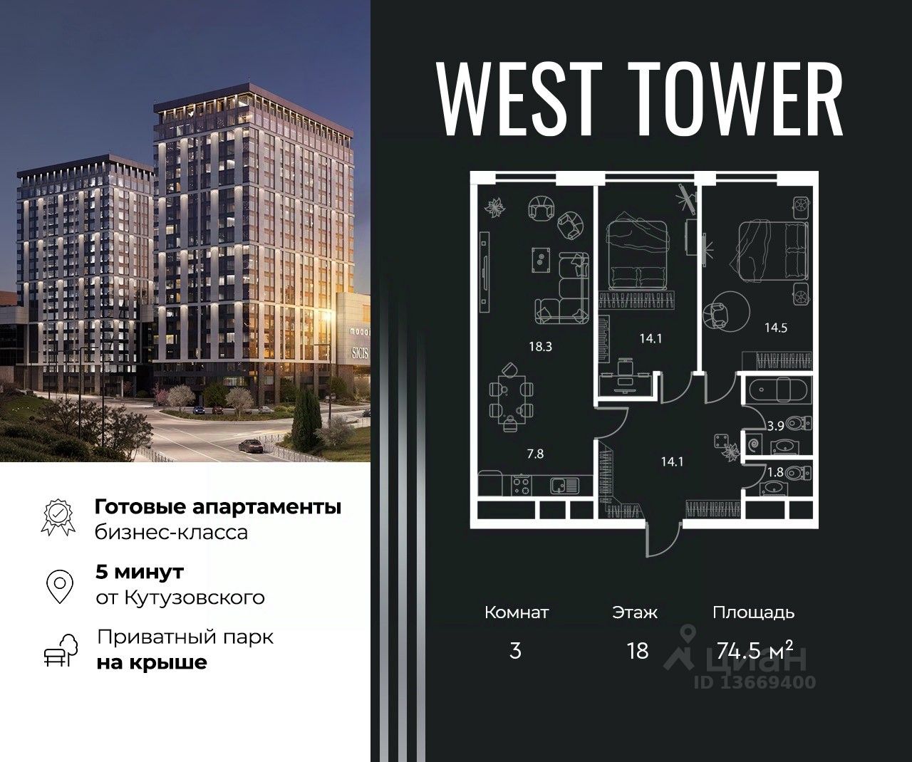West Tower — апартаменты с премиальным сервисом на Аминьевском шоссе. Развитая инфраструктура и хорошая транспортная доступность. Рядом три станции метро: Аминьевская, Давыдково и Мичуринский проспект. У подножия коплекса находится Природный заказника Долина реки Сетунь, который дополнен собственным парком на крыше.