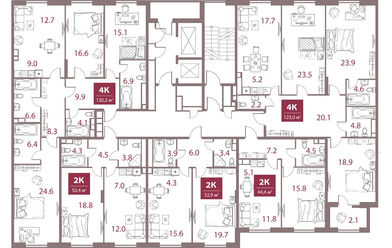 Проект состоит из 9 секций переменной этажности от 8 до 17 этажей. В каждой секции не более 5 квартир на этаже, что обеспечивает высокий уровень приватности.