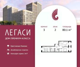 Светлая квартира общей площадью 83 м2 на 4-м этаже премиального жилого комплекса Legacy, расположенного в прекрасном зеленом районе Раменки.
