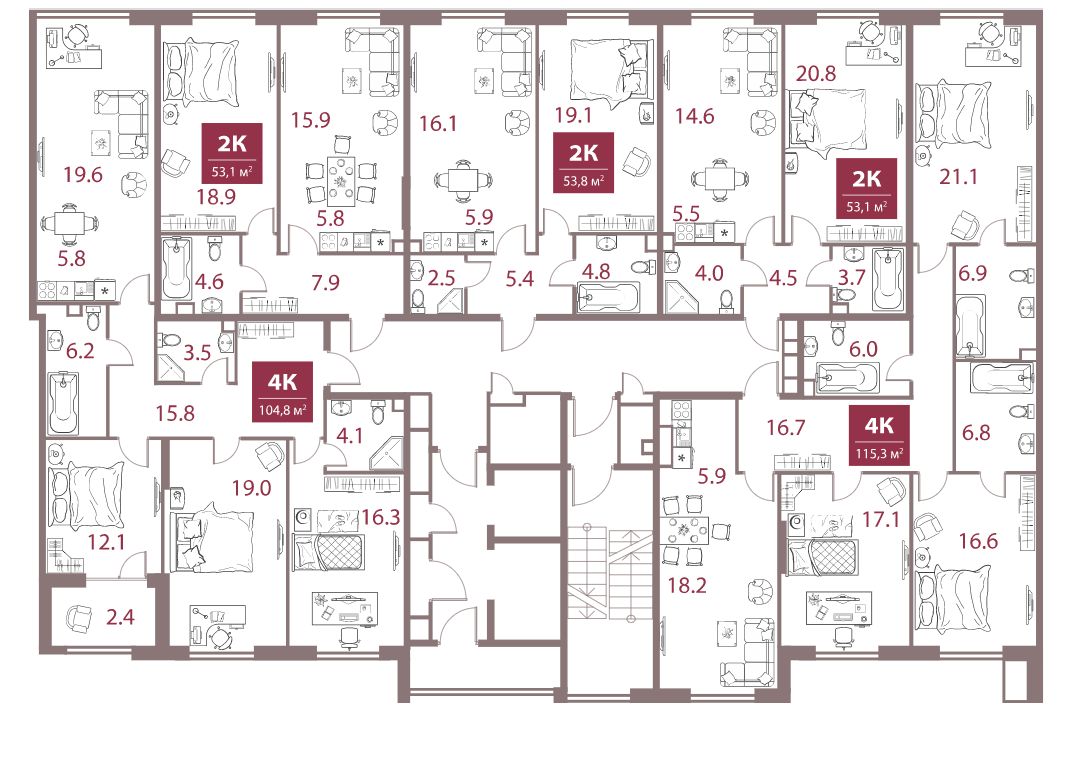 Проект состоит из 9 секций переменной этажности от 8 до 17 этажей. В каждой секции не более 5 квартир на этаже, что обеспечивает высокий уровень приватности.