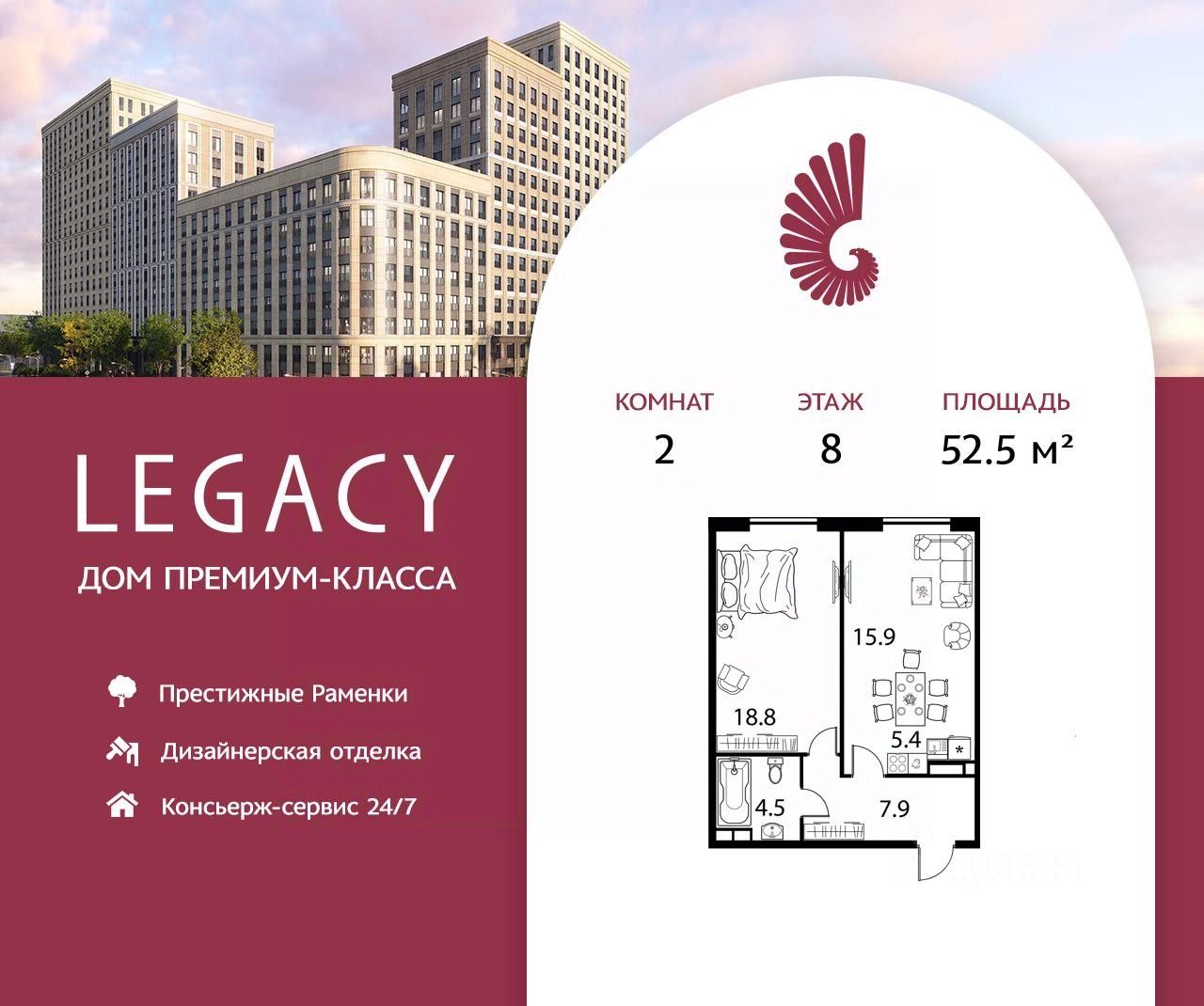 Продается двухкомнатная квартира общей площадью 50,4 м2 на 3 этаже дома премиум-класса Legacy в районе Раменки.