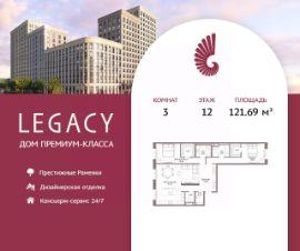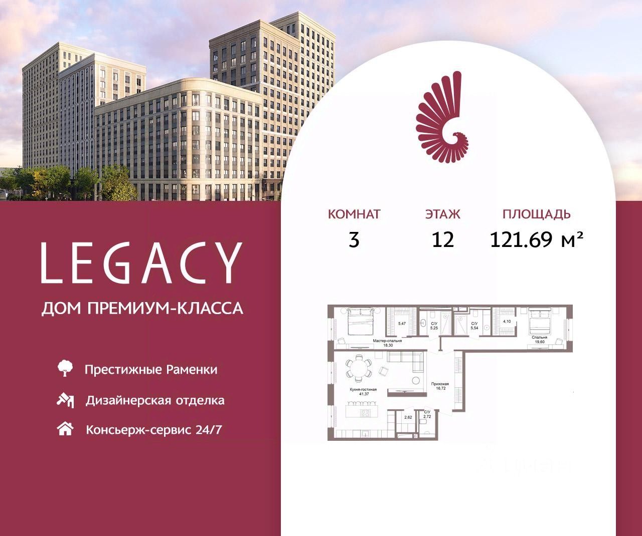 Просторная светлая квартира общей площадью 120,2 м2 на 10-м этаже премиального жилого комплекса Legacy, расположенного в прекрасном зеленом районе Раменки.