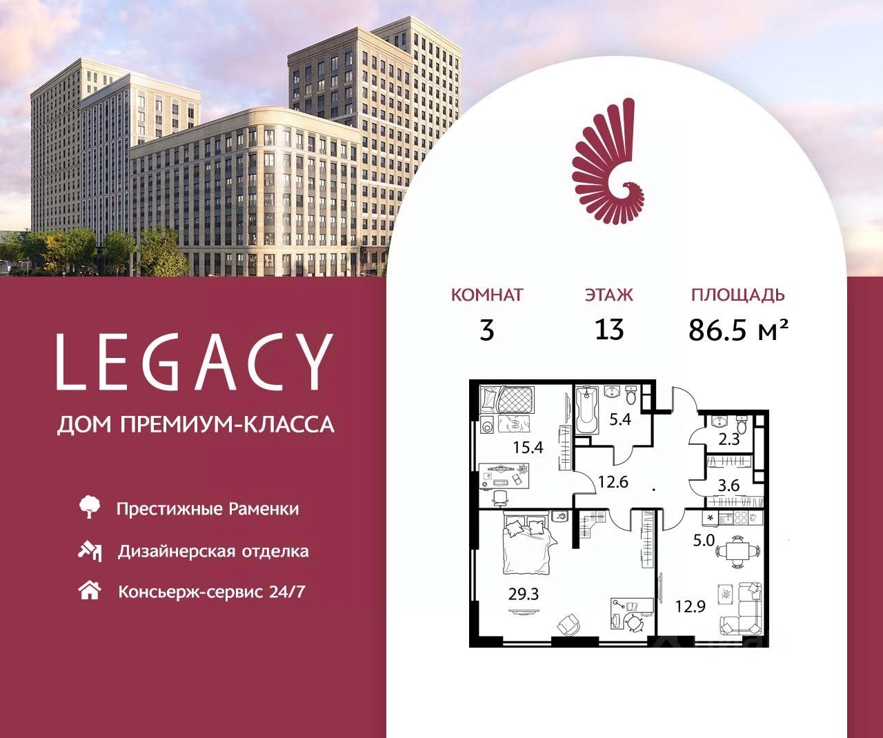 Светлая квартира общей площадью 83 м2 на 4-м этаже премиального жилого комплекса Legacy, расположенного в прекрасном зеленом районе Раменки.