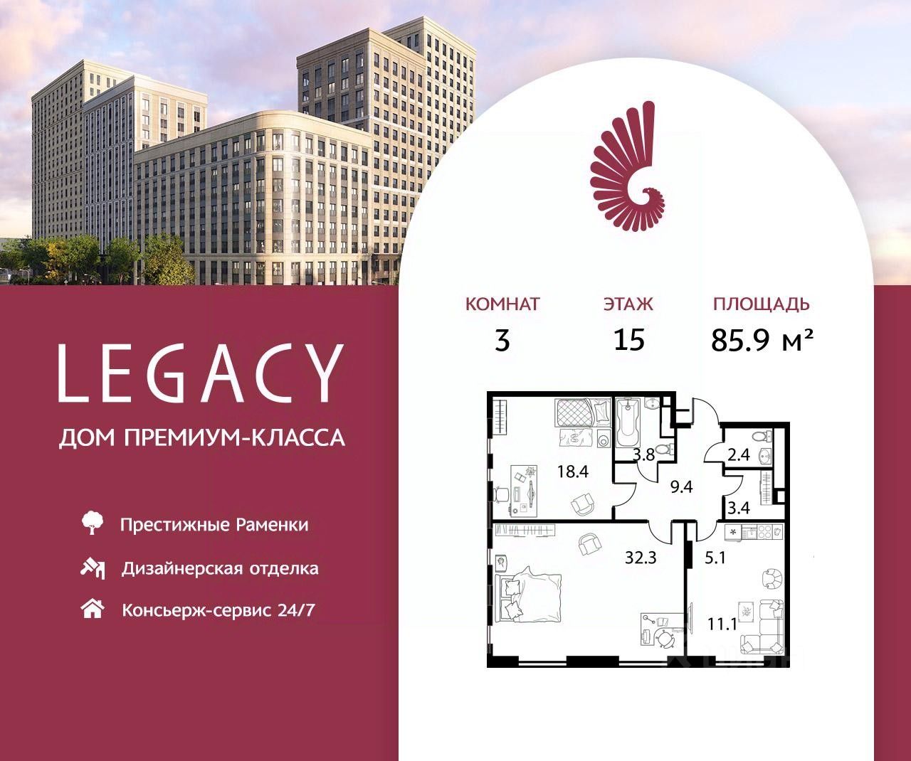 Светлая квартира общей площадью 83 м2 на 4-м этаже премиального жилого комплекса Legacy, расположенного в прекрасном зеленом районе Раменки.