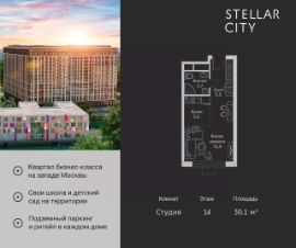 Продается квартира от надежного застройщика Tashir Estate в квартале бизнес-класса Stellar City в ЗАО Москвы. Площадь квартиры составляет: 30.1 кв. м, потолки: 2.9 м Квартира находится на 14 этаже, 4 корпуса жилого квартала Stellar City — микрогорода будущего на орбите Москвы. Stellar City — квартал в ЗАО Москвы вблизи инновационного центра Сколково. В окружении — 11 парков и природных зон, в том числе Долина реки Сетунь, Мещерский лес и парк развлечений The Rink. Город в городе Чтобы дом и инфраструктура вокруг отвечала динамичному лайфстайлу жителя мегаполиса, в основу проекта легла концепция город в городе, которая позволяет решать все бытовые вопросы in-home. В квартале будут возведены школа и детский сад, воркаут-зоны, променад, вело и беговые дорожки, детские площадки для каждого корпуса, а также коммерция на первых этажах для ежедневных покупок. Все необходимое — на расстоянии нескольких шагов. Изящные и лаконичные лобби Авторский дизайн, натуральные материалы в отделке и безупречный интерьер вне времени. Лобби и холлы в проекте бизнес-класса Stellar City ничем не отличаются от входных групп в премиум-сегменте благодаря качественным европейским материалам в отделке, стильному дизайну, консьерж-сервису и уютной зоне ожидания с журнальными столиками и мягкой мебелью. Комфорт и безопасность Закрытая территория, охрана, система СКУД, специально разработанное мобильное приложение дома для резидентов и подземный паркинг с круглосуточным наблюдением и доступом с помощью автоматического считывания номера авто.