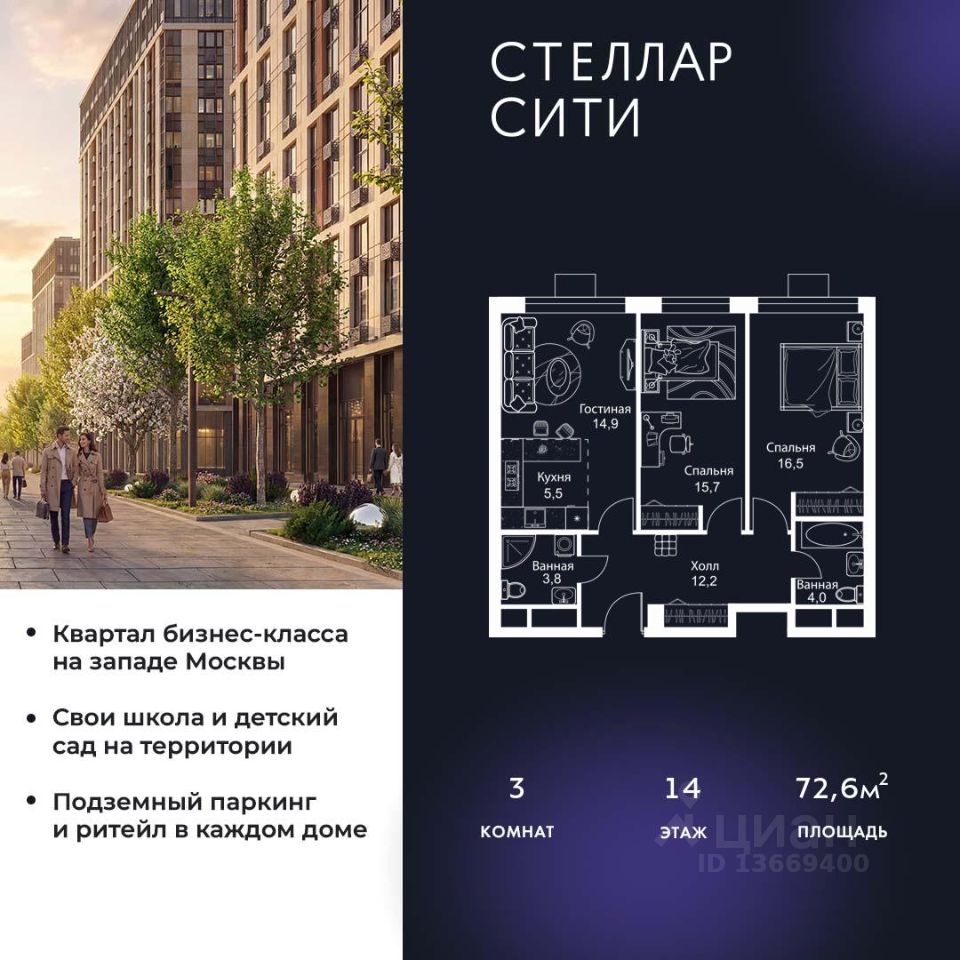 Продается квартира от надежного застройщика Tashir Estate в квартале бизнес-класса Stellar City в ЗАО Москвы.