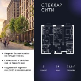Квартира находится на 14 этаже, 4 корпуса жилого квартала Stellar City — микрогорода будущего на орбите Москвы.