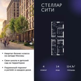 Квартира находится на 14 этаже, 4 корпуса жилого квартала Stellar City — микрогорода будущего на орбите Москвы.