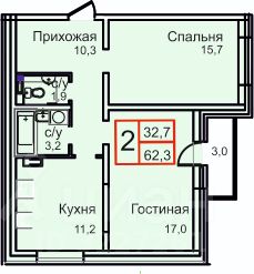 Общая площадь 62,3 кв.м, с двумя раздельными комнатами одна 15,7 кв.м., вторая 17,0 кв.м. Современная кухня 11,2 кв.м. Два раздельных сан узла и удобный коридор.