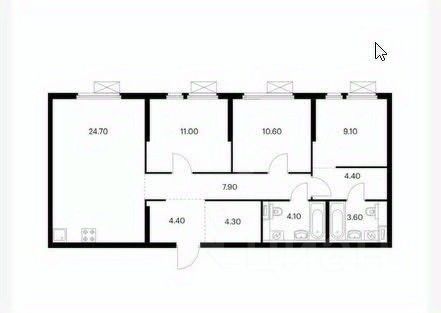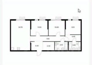 Планировка включает в себя кухню-гостиную, 3 изолированных комнаты (9.10/10.60/11 кв.м.), 2 совмещённых санузла, зону гардероба и коридор.