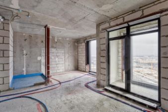 Высокий потолок 3,3м и панорамные окна, визуально увеличивают пространство в квартире.