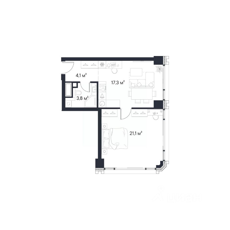 Продаётся 1-комнатная квартира площадью 46,3 м², расположенная на 13 этаже корпуса 2,1.
