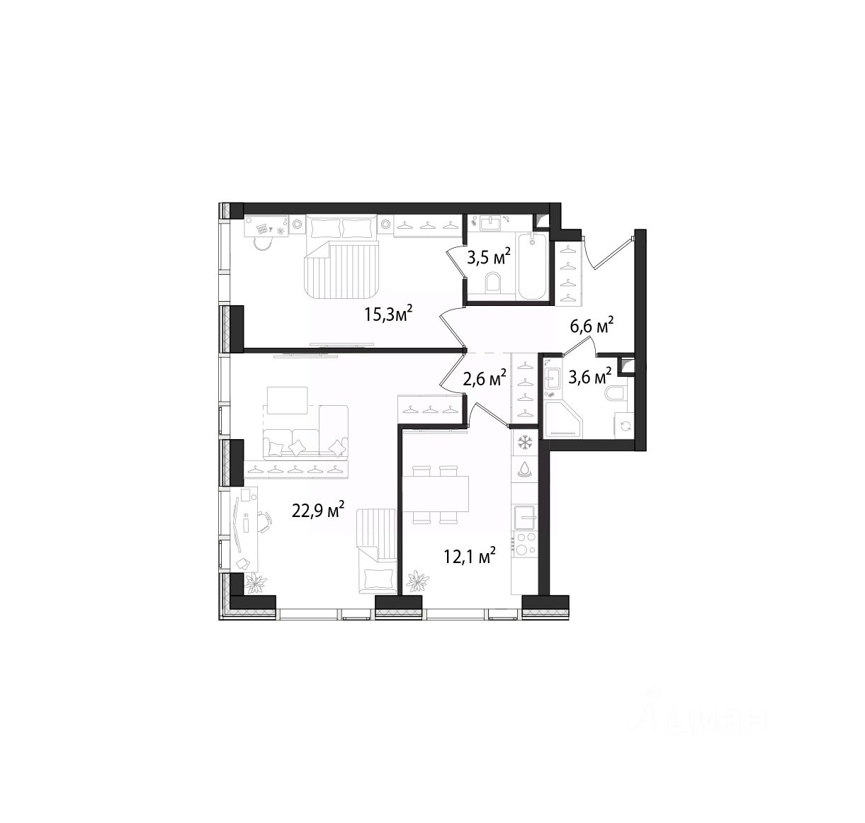 Продаётся 2-комнатная квартира площадью 66,6 м², расположенная на 13 этаже корпуса 2,2.