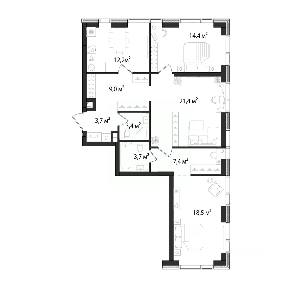 Продаётся 3-комнатная квартира площадью 93,7 м², расположенная на 16 этаже корпуса 2,2.