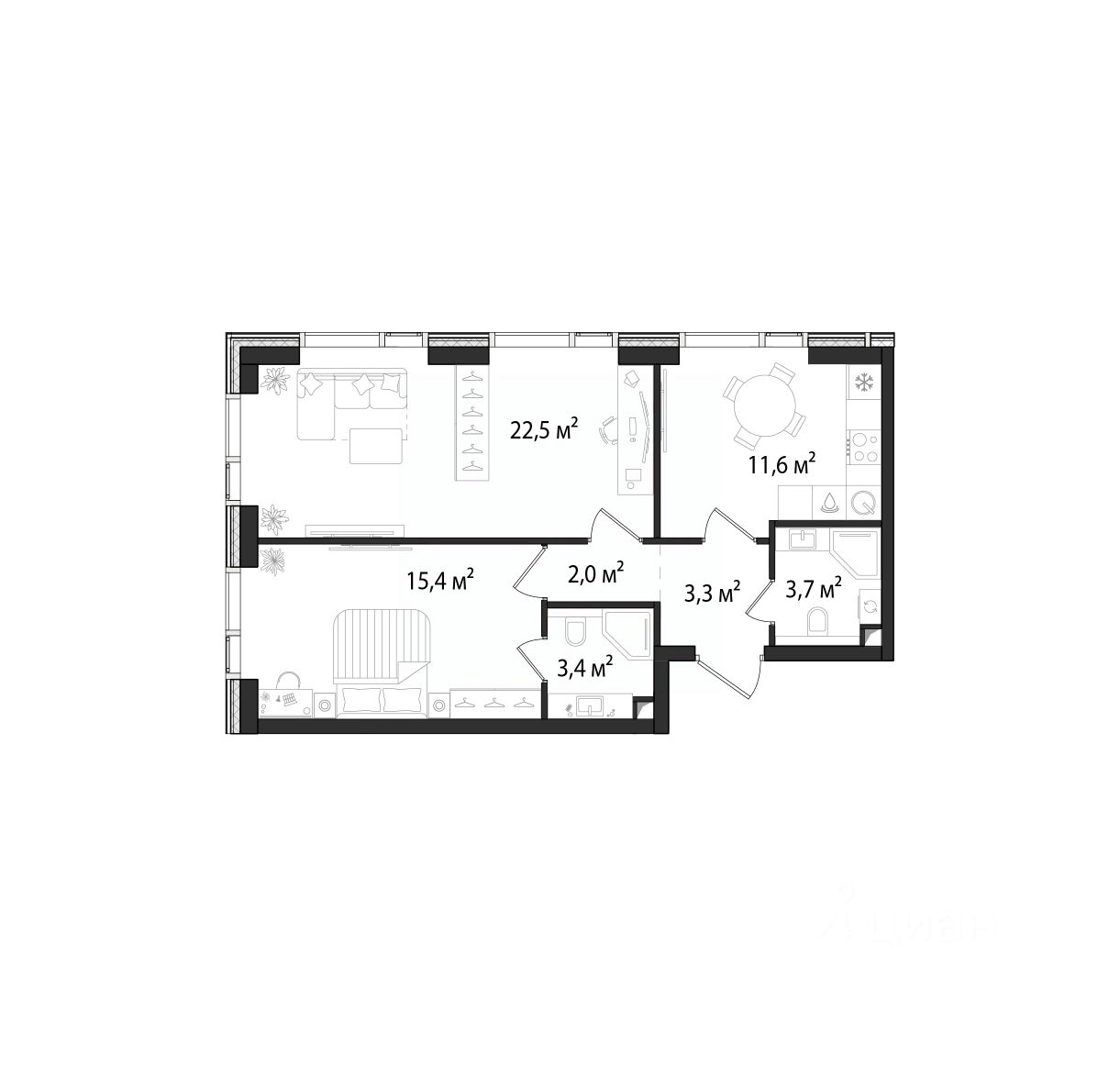 Продаётся 2-комнатная квартира площадью 61,9 м², расположенная на 21 этаже корпуса 2,2.