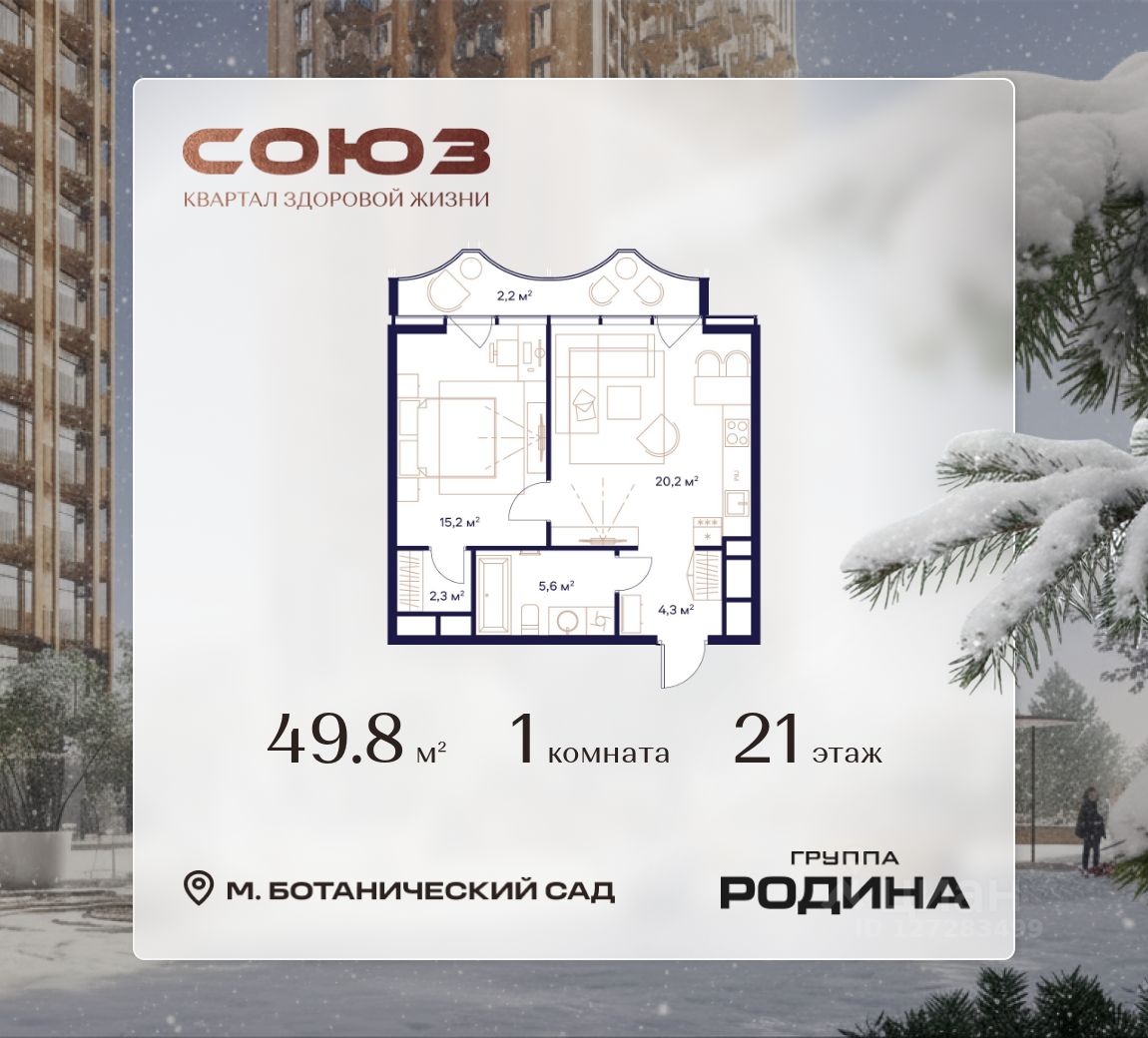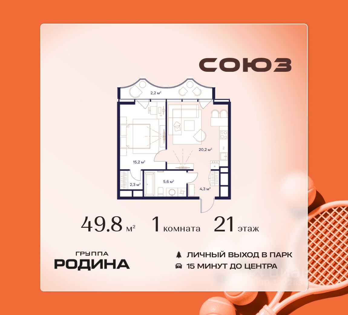 Продаётся 1-комнатная квартира площадью 49.8 м² на 21 этаже в Жилом Комплексе "Союз".