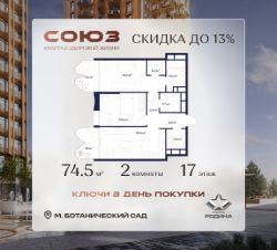 Продаётся 2-комнатная квартира площадью 74.5 м² на 17 этаже в Жилом Комплексе "Союз".