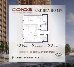 Продаётся 2-комнатная квартира площадью 72.5 м² на 22 этаже в Жилом Комплексе "Союз".
