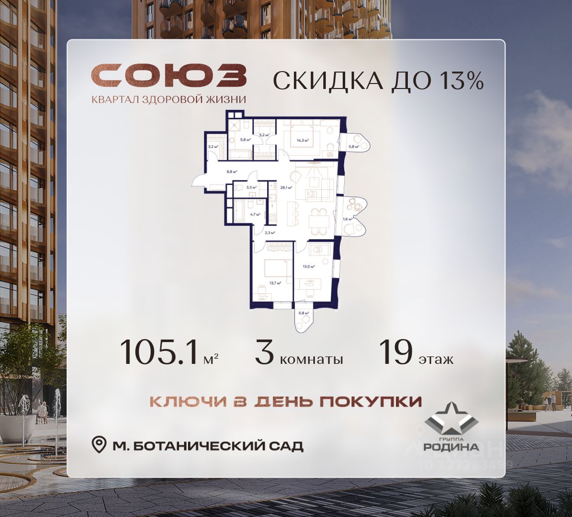 Продаётся 3-комнатная квартира площадью 105.1 м² на 19 этаже в Жилом Комплексе "Союз".