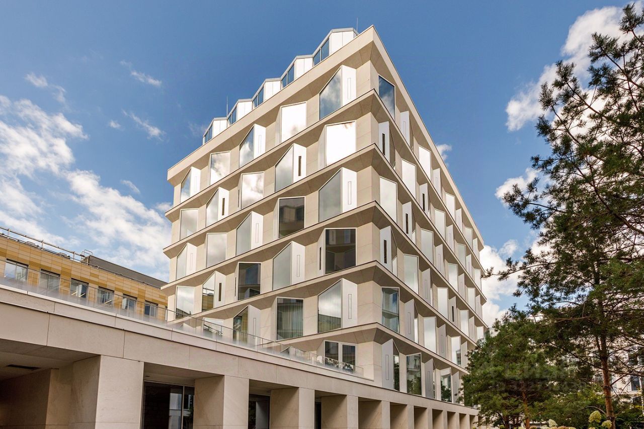 Пять особняков разной этажности составляют пространство комплекса. Фасады домов выполнены из натурального камня, а металлическая отделка окон создает контраст и ритм экстерьера. Современная архитектура элегантно вписана в дизайн-код окружающего района.