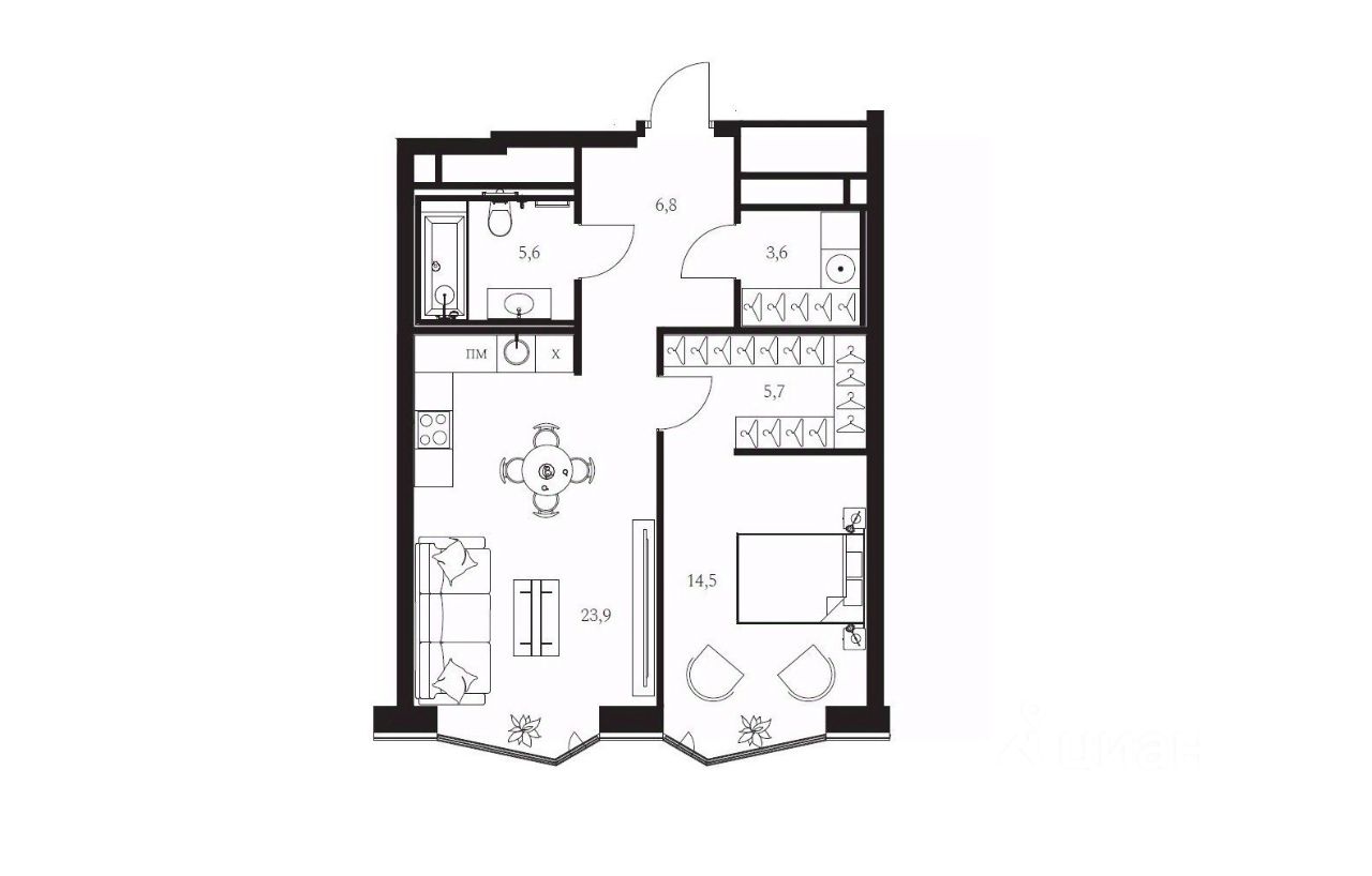 Планировкой можно предусмотреть большую (площадью 24 метра) кухню со столовой зоной, удобную спальню (14,5 метра) с гардеробной комнатой, совмещенный санузел, прихожую с гардеробом и зоной постирочной.