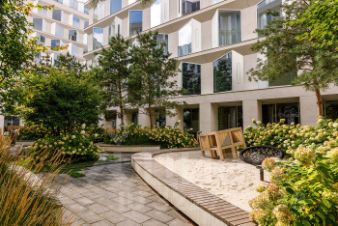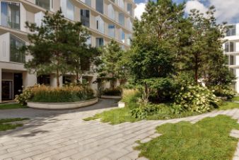 Скрытый от посторонних, изолированный от шума внутренний двор-сад создан немецким архитектурным бюро Udo Dagenbach для идеального отдыха. Даже в холодное время года двор будет зеленым благодаря хвойным деревьям и кустарникам, а с приходом весны сад наполнится палитрой ярких красок и ароматов многолетних цветов.