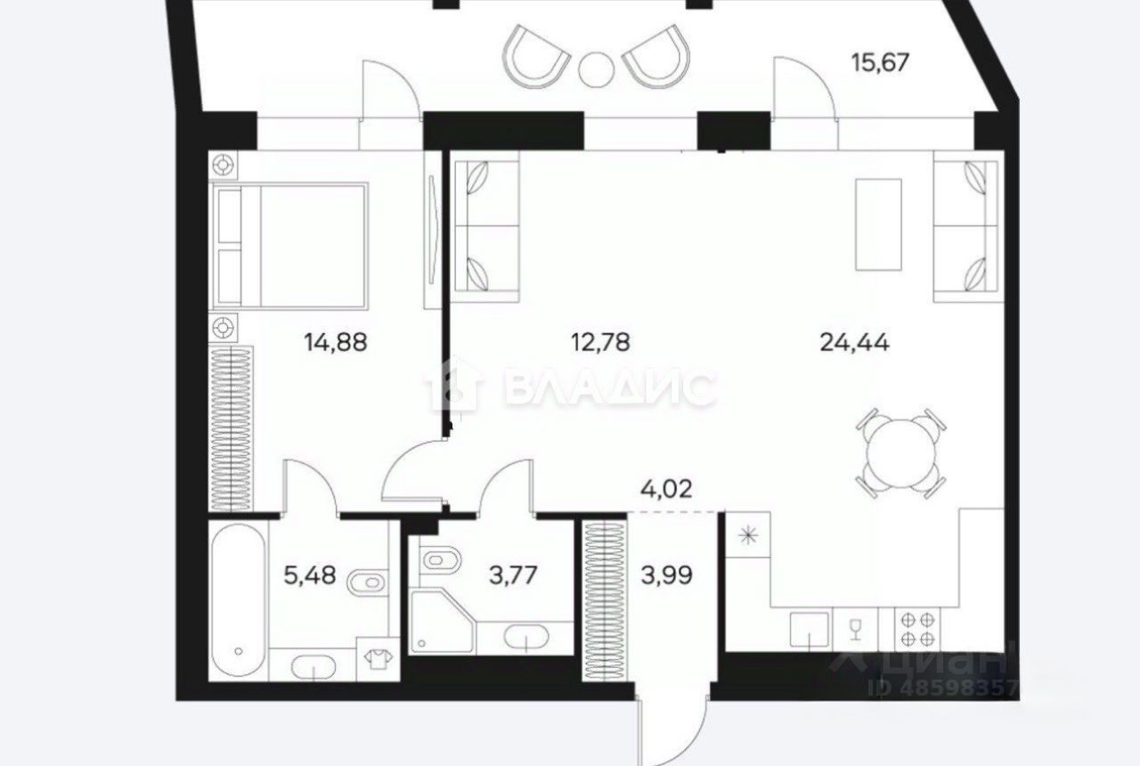 Общая площадь квартиры составляет 86 кв. м, жилая — 28 кв. м, площадь кухни — 25 кв. м. Изолированные комнаты обеспечивают комфорт и уединение.