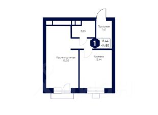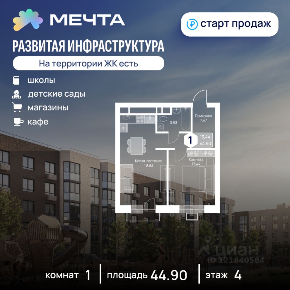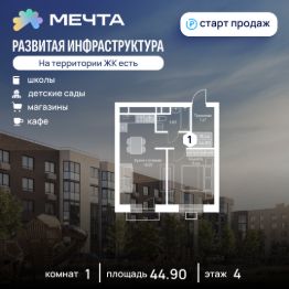 Продается однокомнатная квартира в квартале "Любовь" жилого комплекса "Мечта". Общая площадь квартиры: 44.90 кв. м, этаж 4 из 5.