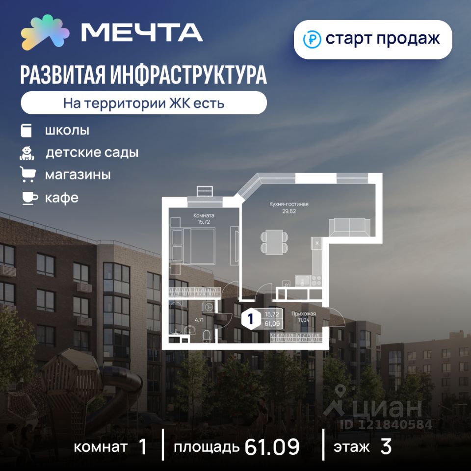 Продается однокомнатная квартира в квартале "Любовь" жилого комплекса "Мечта". Общая площадь квартиры: 61.09 кв. м, этаж 3 из 5.