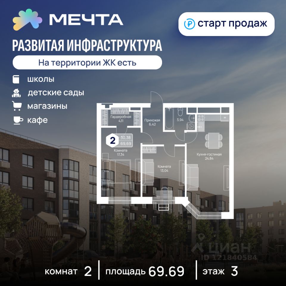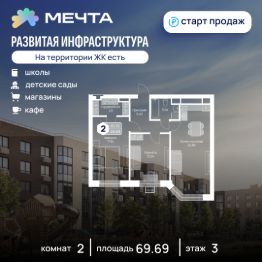 Продается двухкомнатная квартира в квартале "Любовь" жилого комплекса "Мечта". Общая площадь квартиры: 69.69 кв. м, этаж 3 из 5.