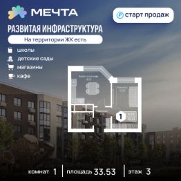 Продается однокомнатная квартира в квартале "Любовь" жилого комплекса "Мечта". Общая площадь квартиры: 33.53 кв. м, этаж 3 из 5.