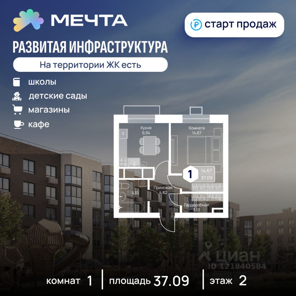 Продается однокомнатная квартира в квартале "Любовь" жилого комплекса "Мечта". Общая площадь квартиры: 37.09 кв. м, этаж 2 из 5.