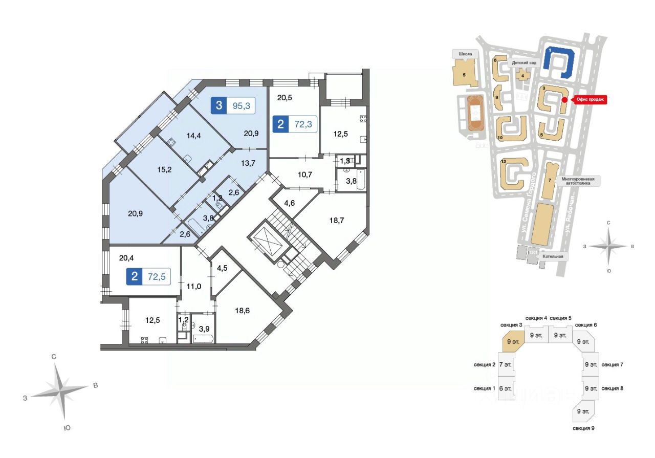 Продаётся 3-комнатная квартира в сданном доме (Семёна Гордого, 1), срок сдачи: III-кв. 2018, общей площадью 95.4 кв.м., на 5 этаже. Расположение, транспортная доступность Жилой комплекс "Ново-Никольское" - это жилой район класса комфорт, в состав которого входят несколько десятков жилых зданий разнообразных форматов (коттеджи, дуплексы, таунхаусы, малоэтажные дома высотой до 3 этажей и многоэтажные корпуса высотой до 9 этажей). Район располагается на просторной территории площадью 115 га рядом с деревней Ивановское Первомайского поселения Троицкого административного округа Москвы, в 21 км от МКАД по Киевскому шоссе. Удобная транспортная развязка, ведущая к шоссе, находится в непосредственной близости от "Ново-Никольского". Трасса пролегает мимо аэропорта "Внуково". Ближайшая железнодорожная станция, "Апрелевка", расположена в десяти километрах от комплекса. Добраться от комплекса до ближайших станций метро можно на маршрутном такси 304 (до станций метро "Румянцево", "Тропарёво" и "Юго-Западная"), на автобусе 526 или маршрутном такси 522 (до станции метро "Тёплый Стан"). Инфраструктура Внутренняя инфраструктура ЖК "Ново-Никольское" включает в себя три детских сада на 150, 100 и 40 мест, две общеобразовательные школы на 825 и 285 мест, школу искусств, торгово-развлекательный центр, минимаркет, различные сервисные службы и другие объекты. Детский сад на 150 мест и школа на 825 мест уже построены и в ближайшее время будут введены в эксплуатацию. Для автовладельцев в комплексе предусмотрены парковочные места, как на придомовой территории, так и в крытом семиуровневом паркинге. Экологическая ситуация здесь благоприятная. Со стороны Киевского шоссе "Ново-Никольское" окружают лесные массивы. Река Десна, протекающая вдоль территории жилого комплекса, украшена живописным каскадом прудов. В километре от комплекса находится усадьба Старо-Никольское, главный дом которой был построен в 19 веке, и отреставрирован в 2015 году. Надежность застройщика Девелопером жилого комплекса "Ново-Никольский" выступает производственно-строительное управление "АГРОСТРОЙ", зарегистрированное в 2005 году. Организация работает как в России, так и в странах ближнего зарубежья. "АГРОСТРОЙ" возводит не только жилую недвижимость, но и социально-значимые объекты инфраструктуры: медицинские центры, торгово-развлекательные комплексы, административные здания. Также в портфеле организации есть спортивные сооружения крытого и открытого типов. При возведении жилых комплексов девелопер ориентируется на строительство целых кварталов с развитой инфраструктурой. Помимо строительных работ, "АГРОСТРОЙ" производит отделочные, комплектующие, строительные материалы, осуществляет земляные работы, занимается прокладкой наружных сетей, разводкой коммуникаций внутри зданий, а также сносом ветхого жилья. Поскольку объекты организация сдаёт "под ключ", она также выполняет отделочные работы и ландшафтное оформление придомовых территорий. Архитектура В комплексе есть все необходимые центра