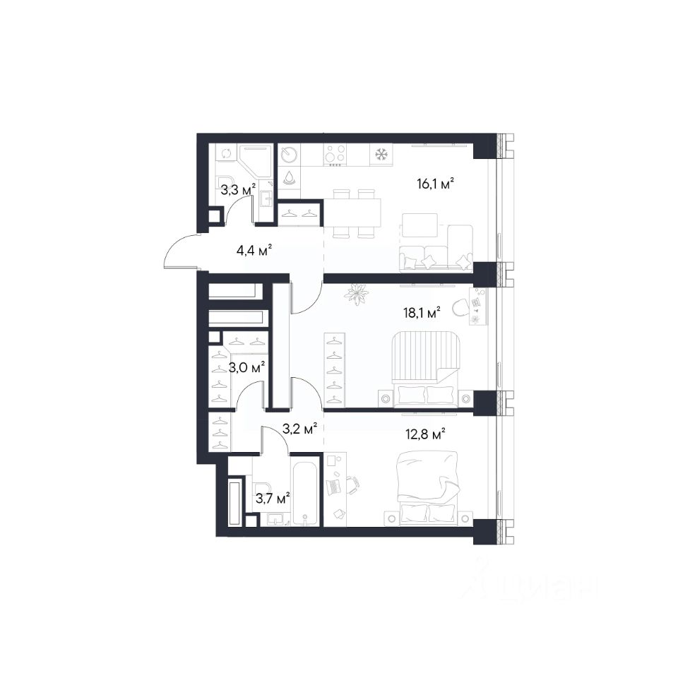 Продаётся 2-комнатная квартира площадью 64,6 м², расположенная на 23 этаже корпуса 2,1.