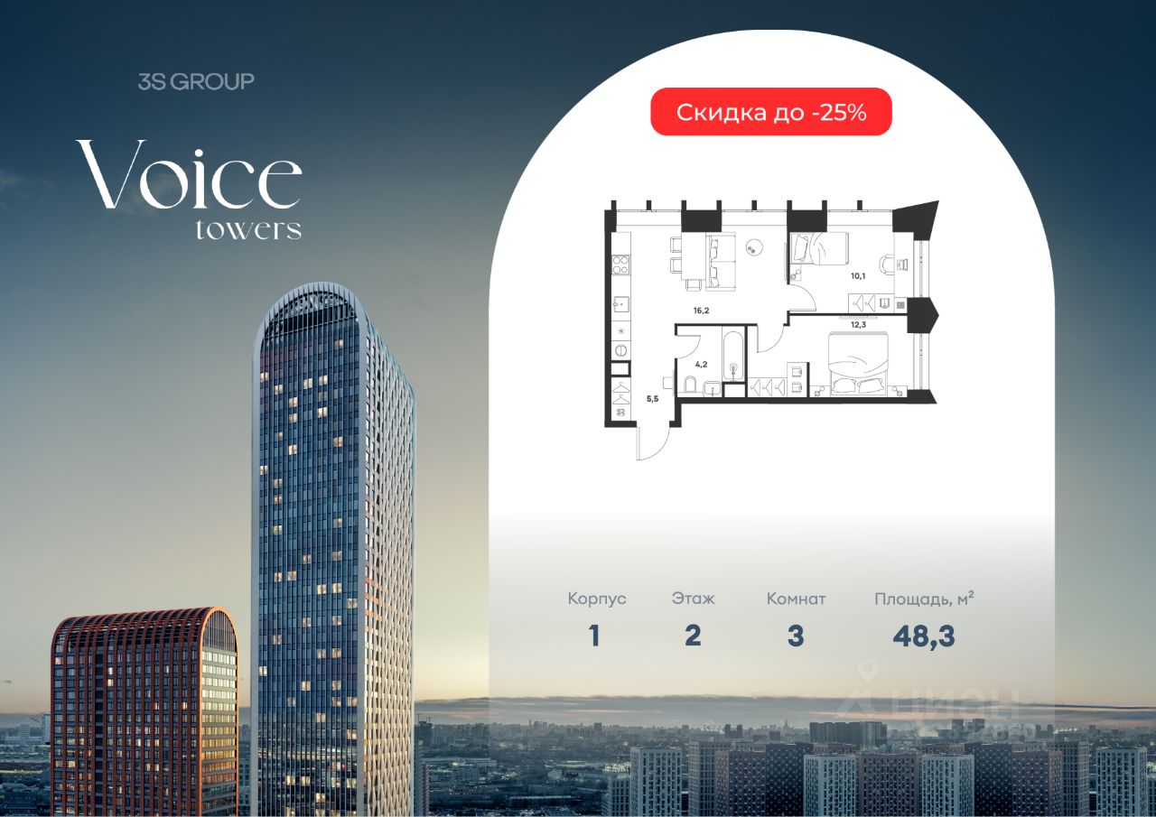 Продается уютная 2-комн. квартира площадью 48,3 кв.м на 2 этаже жилого комплекса бизнес-класса Voice Towers от 3S Group. Общая площадь: 48,3 кв.м., жилая: 32 кв.м., площадь кухни-гостиной: 16,2 кв.м., высокие потолки: 3,12 м., санузел совмещенный.