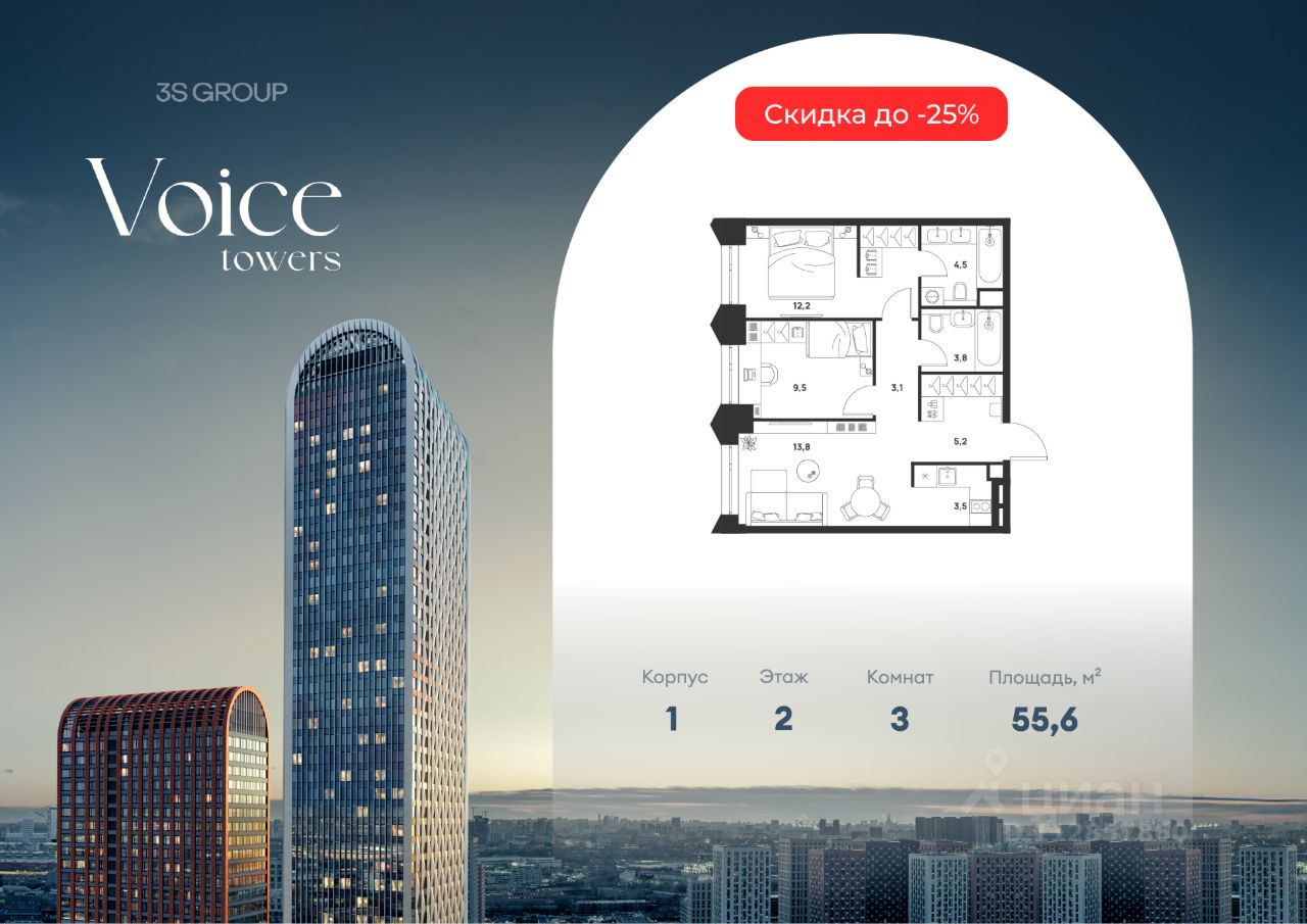 Продается уютная 2-комн. квартира площадью 55,6 кв.м на 2 этаже жилого комплекса бизнес-класса Voice Towers от 3S Group. Общая площадь: 55,6 кв.м., жилая: 35,5 кв.м., площадь кухни-гостиной: 17,3 кв.м., высокие потолки: 3,12 м., санузел совмещенный.