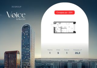 Продается уютная студия площадью 25,3 кв.м на 5 этаже жилого комплекса бизнес-класса Voice Towers от 3S Group. Общая площадь: 25,3 кв.м., жилая: 14,3 кв.м., площадь кухни-гостиной: 18,3 кв.м., высокие потолки: 3,12 м., санузел совмещенный.