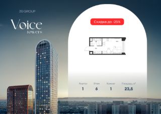 Продается уютная студия площадью 23,5 кв.м на 6 этаже жилого комплекса бизнес-класса Voice Towers от 3S Group. Общая площадь: 23,5 кв.м., жилая: 12,9 кв.м., площадь кухни-гостиной: 16,4 кв.м., высокие потолки: 3,12 м., санузел совмещенный.