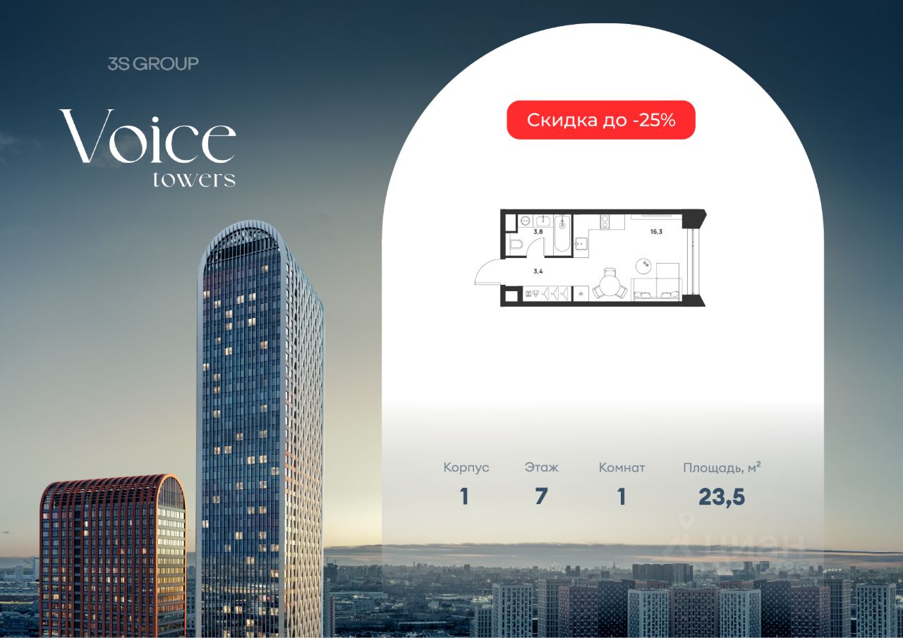 Продается уютная студия площадью 23,5 кв.м на 7 этаже жилого комплекса бизнес-класса Voice Towers от 3S Group. Общая площадь: 23,5 кв.м., жилая: 12,9 кв.м., площадь кухни-гостиной: 16,4 кв.м., высокие потолки: 3,12 м., санузел совмещенный.