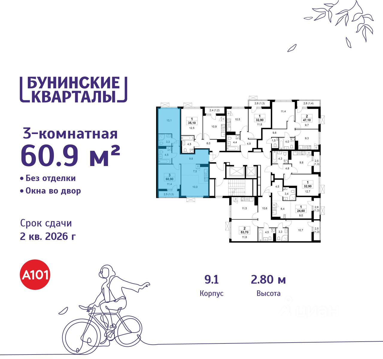 Продается трехкомнатная квартира 105 в новостройке ЖК "Бунинские кварталы" по адресу Москва, ТиНАО, Новомосковский АО, Сосенское С/П, жилой комплекс Бунинские Кварталы, 9.1, район Коммунарка, Новомосковский административный округ, Москва. Общая площадь квартиры - 60.90 кв. м., этаж 10 из 17, секция 2. Тип проекта, по которому построен дом - монолит, компания-застройщик - ООО "А101". Стоимость квартиры - 16191483 Р. Срок сдачи - 2 квартал 2026.