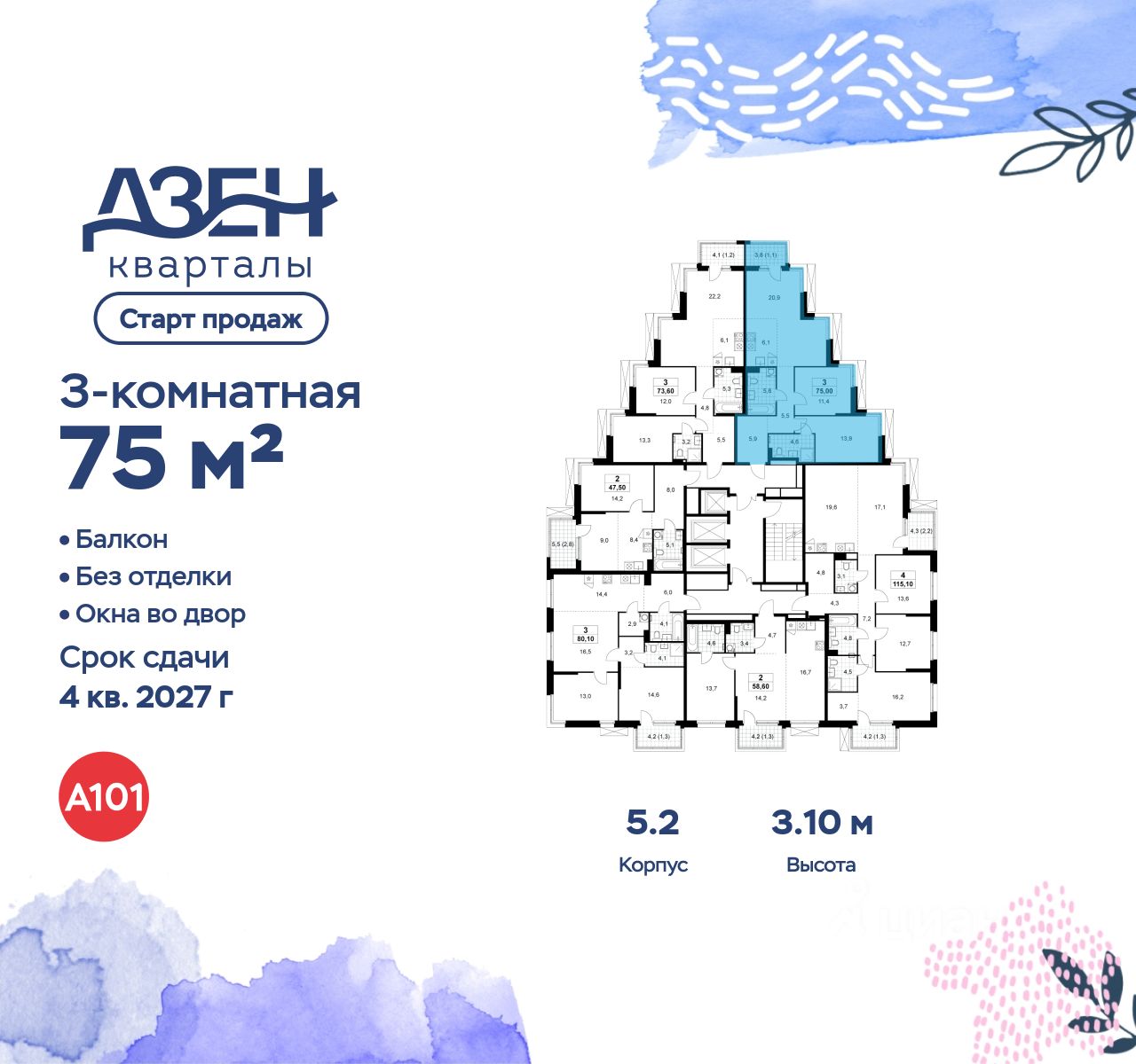 Продается трехкомнатная квартира 219 в новостройке ЖК "Дзен-кварталы" по адресу Москва, ТиНАО, Новомосковский АО, Сосенское С/П, ул. Александры Монаховой, корп. 5.2. Общая площадь квартиры - 75.00 кв. м., этаж 11 из 21, секция 5. Тип проекта, по которому построен дом - монолит, компания-застройщик - ООО "А101". Стоимость квартиры - 22978500 Р. Срок сдачи - 4 квартал 2027.