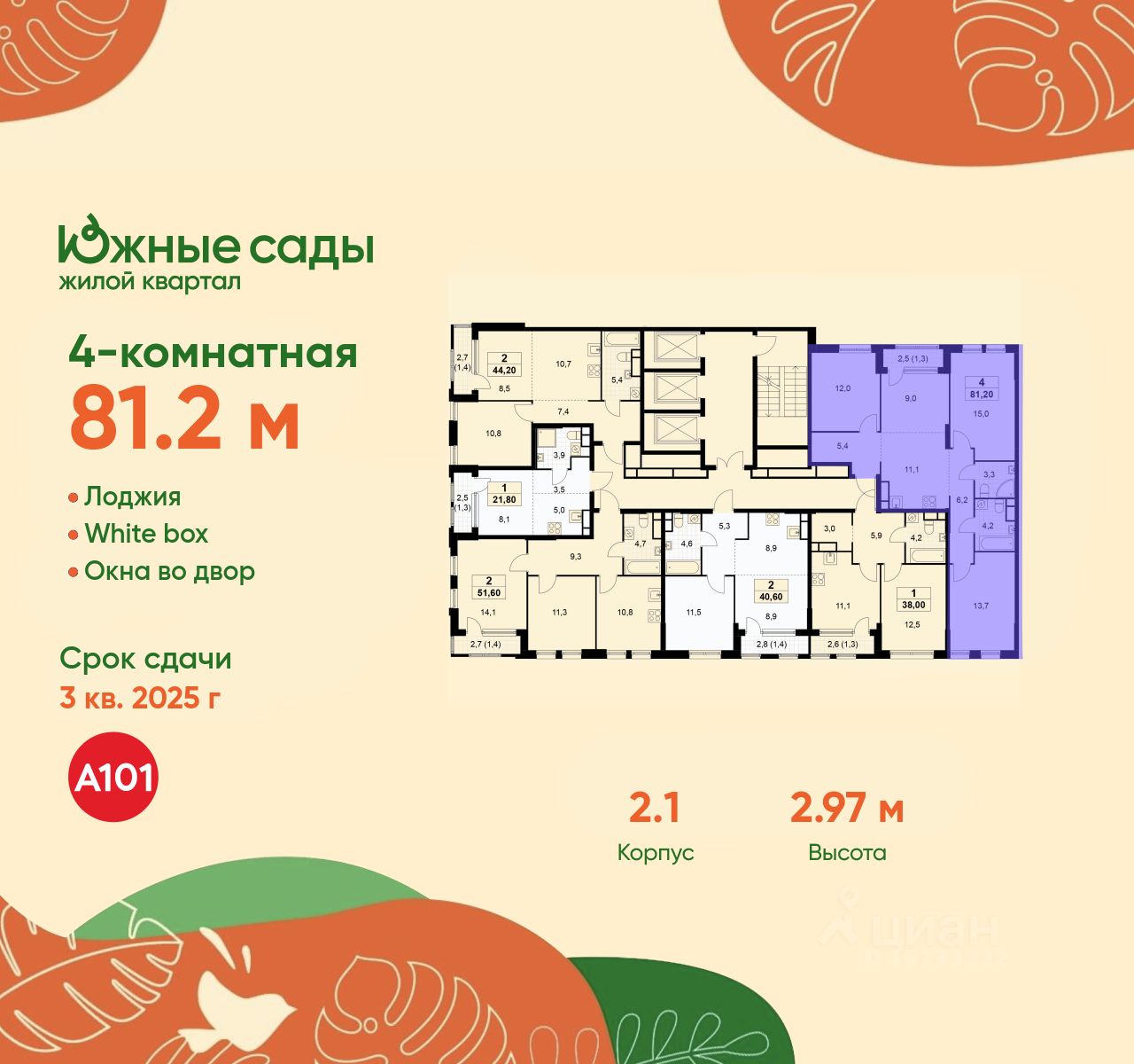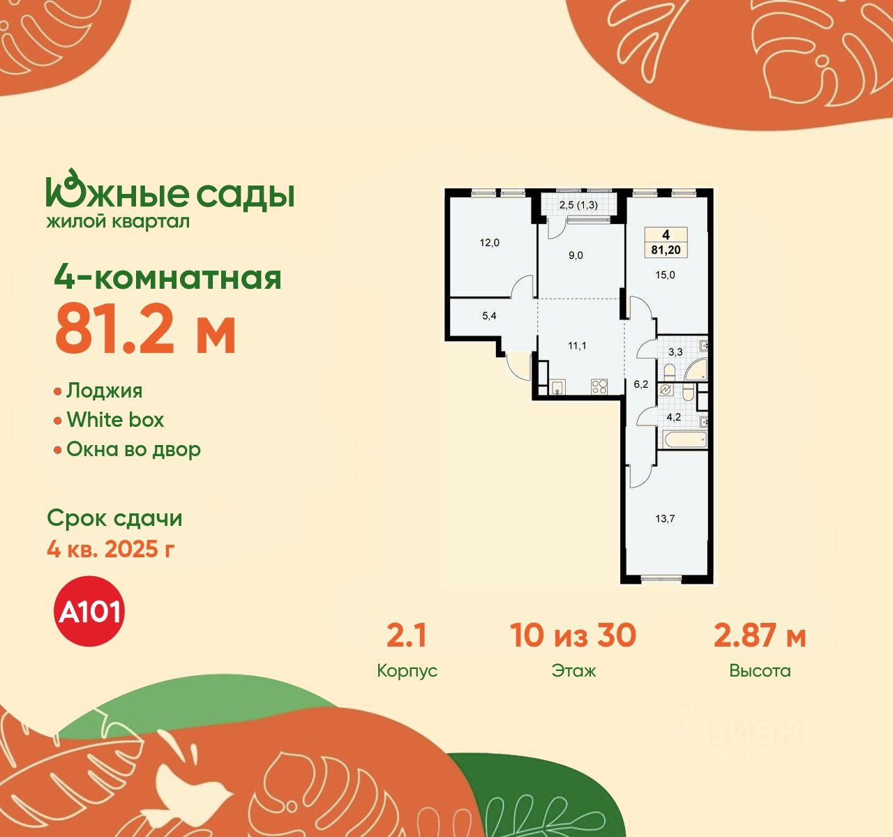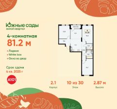 Продается четырехкомнатная квартира 109 в новостройке ЖК "Южные Сады" по адресу Москва, ЮЗАО, Южное Бутово, Жилой комплекс "Южные Сады", корп. 2.1. Общая площадь квартиры - 81.20 кв. м., этаж 10 из 30, секция 2. Тип проекта, по которому построен дом - монолит, компания-застройщик - ООО "А101". Стоимость квартиры - 30015580 Р. Срок сдачи - 4 квартал 2025.