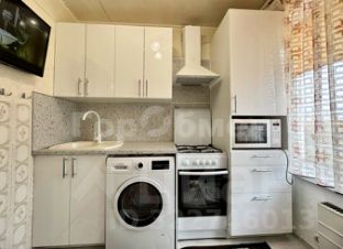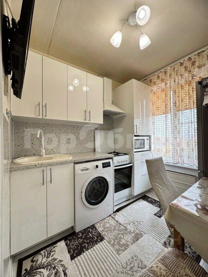 новая кухня со всей техникой: холодильник, плита, стиральная машина.