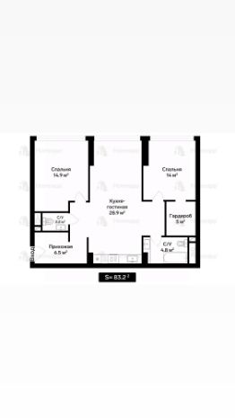 Согласно линейной планировке пространства в квартире: 2 спальни с зонами гардеробных, 2 санузла, большая кухня-гостиная.